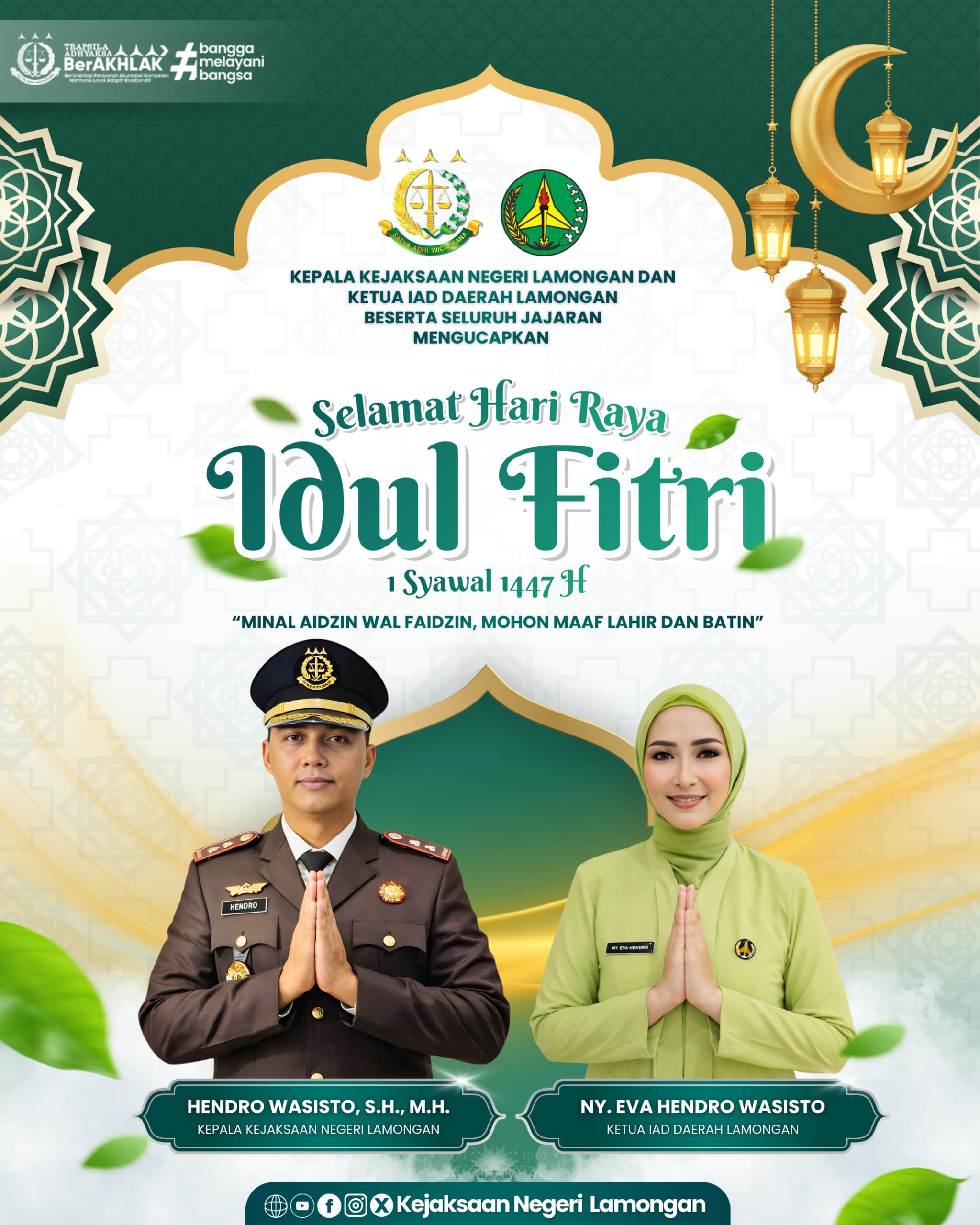 “Atas nama pribadi, keluarga, dan seluruh jajaran pegawai Kejaksaan Negeri Lamongan, kami mengucapkan Selamat Hari Raya Idul Fitri 1 Syawal 1447 H. Minal Aidzin Wal Faidzin, Mohon Maaf Lahir dan Batin,” ujar Hendro Wasisto.