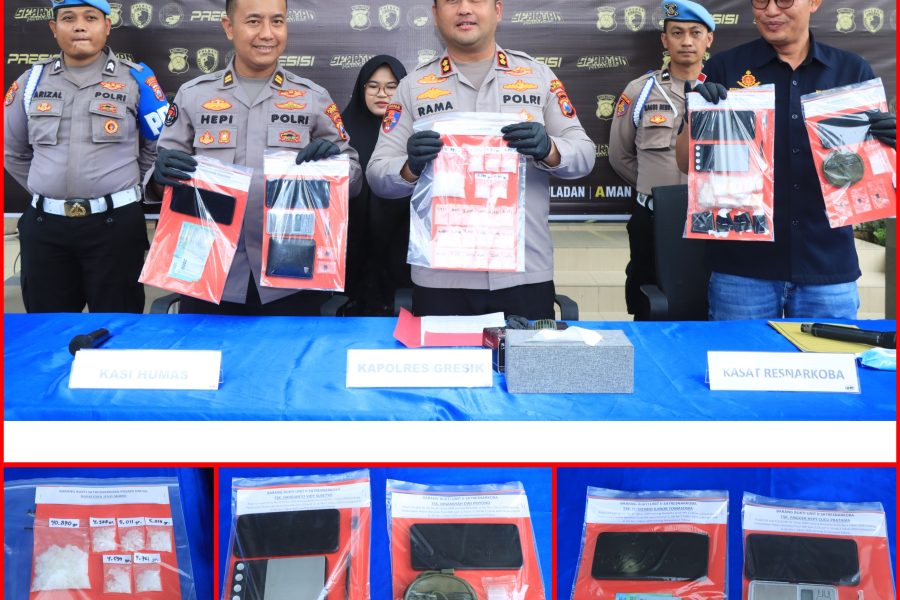 Polres Gresik berhasil mengamankan total 68,211 gram sabu yang terbagi dalam 25 paket siap edar. Selain narkotika, petugas juga menyita timbangan digital/elektrik. Sejumlah unit handphone yang digunakan untuk transaksi. Kartu debit dan uang tunai hasil penjualan.